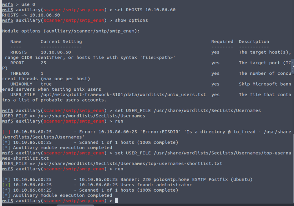 We can do this manually, over a telnet connection- however Metasploit comes to the rescue again, providing a handy module appropriately called "smtp_enum" using this we will be able to get the username.
